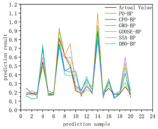 Figure 11 shows a comparison between the predicted and actual values of the BP neural network optimized by six algorithms (CPO-BP, PO-BP, DBO-BP, GOOSE-BP, SSA-BP, GWO-BP). It can be observed that the PO-BP and CPO-BP algorithms yield predictions that are closer to the actual values, with overall stable performance. In contrast, other optimization algorithms such as DBO, GOOSE, and GWO exhibit larger deviations at certain data points, particularly at extreme values, indicating potential local optimum issues when handling specific cases.