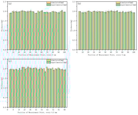 As shown in Table 5, the thinning rates were obtained from the PO-BP neural network and finite element simulation. These are prediction results rather than direct measurements, and therefore further validation is required. To this end, we compared the experimentally measured thickness with the simulation results at three representative cross-sections of the crash beam (a, b, and c), as indicated in Figure 1. At each cross-section, thickness values were measured at 20 positions and compared with the corresponding simulation results, as shown in Figure 14a–c. The results indicate that the experimentally measured thickness closely matches the simulation results, with deviations generally within 5%. In particular, the mean absolute error (MAE) between simulation and measurement is 0.024 for cross-section a, 0.018 for cross-section b, and 0.021 for cross-section c, further demonstrating the reliability of the predictions in Table 5.