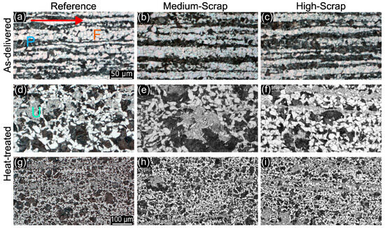 Optical micrographs of the as-delivered and heat-treated samples after etching with Nital are presented in Figure 1. Nital etching enhanced the visibility of the ferritic–pearlitic microstructure, making it easier to distinguish the individual phases based on color contrast: ferrite appears whitish, whereas pearlite appears dark. The contrast between ferrite and pearlite in etched microstructures arises from their differing etching behaviors. In pearlite, the presence of cementite promotes localized galvanic activity at ferrite–cementite interfaces, resulting in accelerated etching and a darker appearance. In contrast, ferrite is etched more uniformly and to a lesser extent, appearing comparatively lighter. All three as-delivered samples of the Reference, Medium-Scrap and High-Scrap alloys, presented in Figure 1a–c, respectively, exhibit a similar ferritic–pearlitic microstructure with elongated uniaxial ferritic and pearlitic grains at approximately the same phase content and comparable grain size. This microstructure is typical for a low-alloyed low-carbon steel after hot rolling [38]. After heat treatment, the retained ferritic–pearlitic microstructure in the case of all alloys presents more regularly distributed, equiaxial grains.