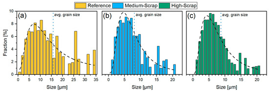 Histograms of BCC α-Fe grain size distributions of (a) Reference, (b) Medium-Scrap and (c) High-scrap alloys in heat-treated state from the EBSD analysis. The black dashed line represents fitted lognormal distribution, and the dark blue dotted line marks the average grain size.