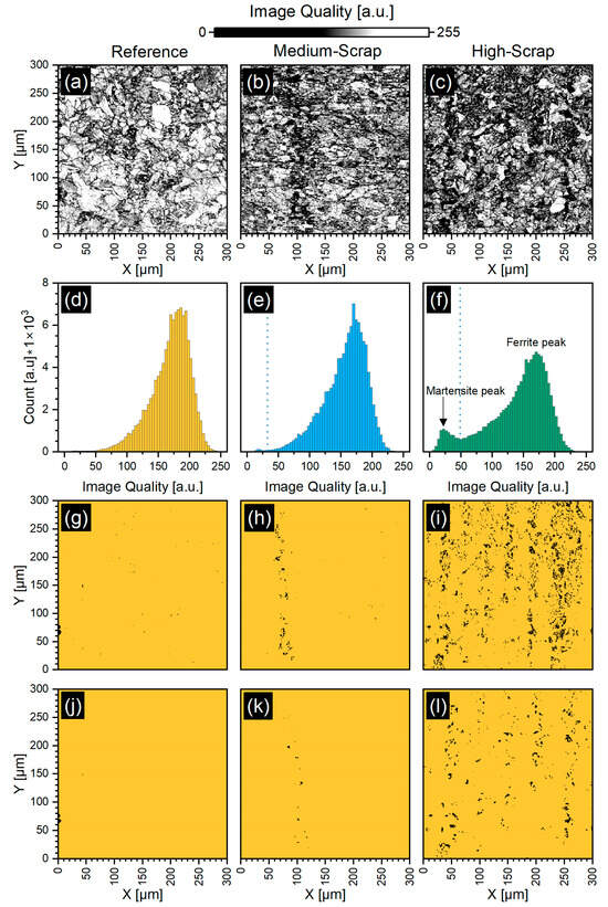 Furthermore, the histograms of EBSD image quality for the three heat-treated samples are presented in Figure 3a–c. It is apparent from Figure 3 that, with the increasing content of trace and tramp elements, the BCC image quality and pattern recognition decrease. In accordance with the methodology developed by Calcagnotto et al. [27], histograms for the image quality factor were generated from IQ maps and are presented in Figure 3d–f for the three alloy variants. For the Reference alloy, an IQ distribution with a single peak is visible (Figure 3d), whereas for the Medium alloy (Figure 3e), a bimodal distribution begins to form. In the High-Scrap (Figure 3f) variant, two distinct peaks are visible, with a threshold value marked by a dotted line located at the minimum between the two peaks. The additional peak on the left-hand side of the dotted line is attributed to martensite with a lower IQ compared to ferrite, according to Calcagnotto et al. [27]. In contrast, the Reference alloy exhibits only one peak, which is associated with the BCC ferrite phase. The black areas shown in Figure 3h and Figure 3i represent the fraction of the EBSD image quality below the threshold value, defined in Figure 3e and Figure 3f, which was set for the Medium and High-Scrap trial alloys, respectively, after also applying the first elimination condition introduced in the Section Martensite Phase Assessment. Figure 3k,l present the final qualitative analysis of martensite for the Medium and High-Scrap trial alloys, respectively, after applying the secondary condition (in the Section Martensite Phase Assessment). When comparing the Reference alloy to Medium and High-Scrap trial alloys shown in Figure 3j, Figure 3k and Figure 3l, respectively, a trend of an increasing martensite phase fraction can be seen with the increasing concentration of trace and tramp elements.
