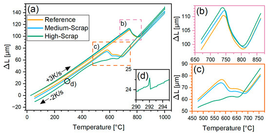 The three alloys were continuously heated in situ using the dilatometer integrated into the P07B beamline, which allows for monitoring the length changes in the samples during the thermal cycle while also recording 2D diffractograms. Figure 4 presents the in situ-recorded changes in the length (∆L) vs. temperature curves for the Reference, Medium and High-Scrap samples.