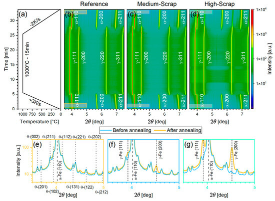 In (a), the temperature–time cycle applied during the heat treatment is presented, while in (b–d), Intensity-2θ diffractograms recorded in situ are collated into phase plots of the Reference, Medium and High-Scrap alloys in a 2θ range of 3.5–7.5 deg, respectively. Additionally, in (e–g), a comparison of individual intensity-2θ profiles from before and after the thermal cycle, picked from highlighted regions in (b–d), are shown for the Reference, Medium-Scrap and High-Scrap alloys, respectively.