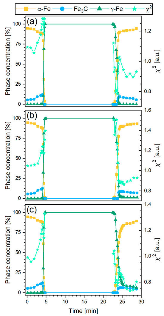 In addition to the qualitative phase analysis presented above, the intensity-2θ profiles, evaluated from the 2D diffraction patterns at different stages of the thermal cycles, were further evaluated using Rietveld refinement. The main objective was to quantitatively evaluate the volume fraction of the α-Fe, γ-Fe and Fe3C phases within the three alloys, the results of which are presented in Figure 6a–c.