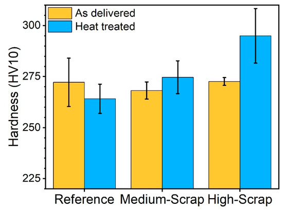 In the as-delivered state, average Vickers hardness values of 272.2 ± 11.84 HV, 268.2 ± 4.16 HV and 272.6 ± 1.92 HV were measured for the Reference, Medium-Scrap and High-Scrap samples, respectively (see Figure 7).