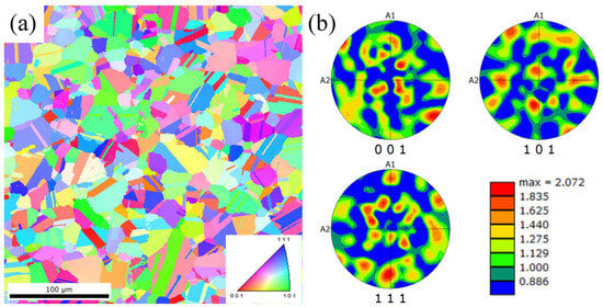 (a) Inverse pole figure map of γ grain in FGH96 superalloy and (b) corresponding pole figures.