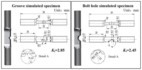 Geometric dimension of two simulated specimens and the corresponding stress concentration factors (Kt).