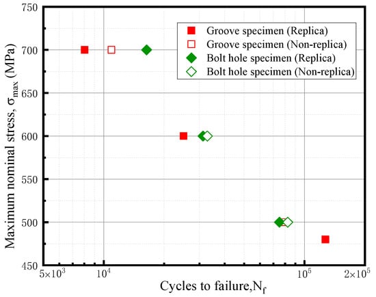 For the fatigue lives of the two simulated specimens, the bolt hole simulated specimens exhibited a longer fatigue lifetime at a stress level of 700 MPa. However, when the stress was reduced to 500 MPa, there was no obvious difference in fatigue lifetime between the two specimen types. This outcome may be attributed to variations in fatigue crack initiation and propagation behavior influenced by notch geometry, which will be analyzed in detail in subsequent sections.