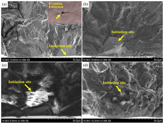 SEM fractographs of simulated specimens tested at 500 °C displaying the different types of initiation sites: (a) surface slip band initiation (Specimen B-1); (b) crystallographic facet initiation (Specimen B-3); (c,d) inclusion initiation (Specimen G-5).