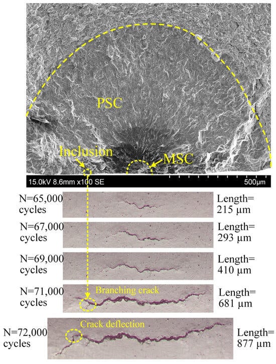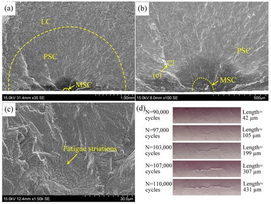 Figure 6 and Figure 7 illustrate representative fracture surfaces and corresponding surface replicas as a function of cycles for specimens with cracks initiated in inclusions and crystallographic facets. The fracture surface of specimen G-5 (Figure 6) highlights three distinct regions characterized by different crack growth behaviors: microstructurally small crack (MSC), physically small crack (PSC), and long crack (LC) growth regions (Figure 6a). Near the initiation site (Figure 4c), extension edges were visible. The size of the long axis of the equivalent ellipse of the MSC growth region is approximately 180 μm (Figure 6b). No fatigue striations were observed in this region. As the crack propagated into the PSC region, the fracture surface displayed a river pattern aligned with the crack propagation direction, along with visible fatigue striations (Figure 6c). In the LC region, the fracture surface was dominated by cleavage-like fracture facets and slip steps. Surface replicas taken at various cycle intervals provided additional insights into small crack growth behavior. In the MSC region, the crack initiated in the inclusion exhibited a non-planar geometry (Figure 6d). As the crack length increased, its growth path transitioned to a zig-zag trajectory, predominantly oriented perpendicular to the loading direction.