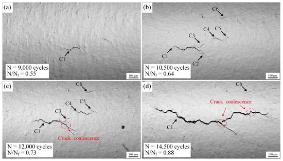 The morphology evolution of multiple cracks observed at surface replicas for the specimen B-1. Test conducted with σmax = 700 MPa, R = 0.05. (a) N = 9,000 cycles, (b) N = 10,500 cycles, (c) N = 12,000 cycles, (d) N = 14,500 cycles.
