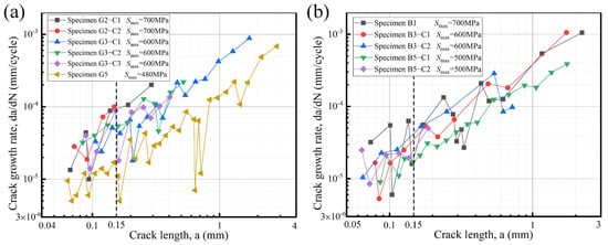 where Δa and ΔN are the crack growth increment and cyclic interval, respectively, and ai is the surface crack length at Ni cycles. The results indicate noticeable fluctuations in crack growth rates during the early stages of fatigue crack growth. When highly fluctuating data points are excluded, the growth rates of small cracks remain relatively constant for crack lengths below 150 μm. Beyond this length, the growth rate accelerates as the crack length grows. These phenomena are commonly observed for fatigue cracks initiating from notches [,,,]. Furthermore, no significant differences in fatigue crack growth rates were observed between the bolt hole and groove simulated specimens.