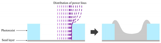 Currently, there is limited literature on Sn-Pb micro-bump electroplating, and existing studies mainly focus on centimeter-scale substrates. The direct application of centimeter-scale electrodeposition processes to micro-bumps results in poor coating quality. The predominant challenge of Sn-Pb electroplating at the microscale is the “edge effect” of electric field lines, as shown in Figure 1. This refers to the phenomenon where the current density is higher in edge regions than in other areas, causing faster metal deposition and thicker coatings at the edges. Particularly under high current densities, this leads to local over-plating or under-plating. This, in turn, has the potential to have a detrimental effect on the conductivity and reliability of the bumps [24,25].