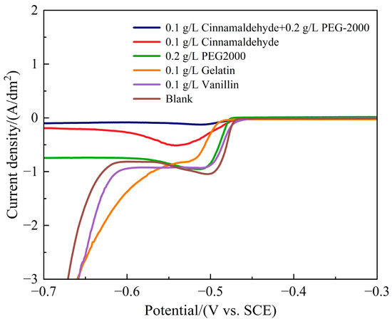 Based on the above characterization results of coating morphology and elemental composition, to further explore the influence mechanism of different additives on the electrochemical behavior of Sn-Pb codeposition, LSV was used to systematically study the cathodic polarization characteristics. Figure 5 shows the cathodic polarization curves of plating baths with different additives. It can be seen from the figure that without additives, the deposition potential of reactants is −0.47 V, and the limiting current density is 1.05 A/dm2. After adding different types of additives, the deposition potential shifts negatively, with gelatin exhibiting the most pronounced effect; the cathodic polarization increases, with cinnamaldehyde + PEG-2000 showing the most significant effect; the limiting current density decreases, indicating that additives hinder the Sn-Pb electroplating process, reduce the rate of electrode reaction, and lead to a decrease in reduction current. When different additives are used, the order of cathodic polarization intensity is as follows: cinnamaldehyde + PEG-2000 > cinnamaldehyde > PEG-2000 > gelatin > vanillin ≈ additive-free, indicating that adding 0.1 g/L cinnamaldehyde and 0.2 g/L PEG-2000 has the best leveling effect, which is consistent with the scanning results. The reason is that cinnamaldehyde, as an aromatic aldehyde, forms a strong adsorption layer on the electrode surface through its benzene ring and aldehyde group, while PEG-2000 is a long-chain polymer that can enhance the compactness of the adsorption layer through entanglement. The synergistic effect of these elements results in a dense composite adsorption layer that complicates the ion diffusion path, reduces the limiting current density to a minimum and maximizes the cathodic polarization.