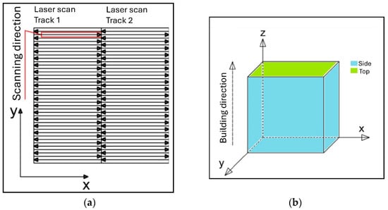 (a) Laser scanning strategy in the layers and (b) building direction and top and side sections.