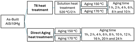 Generally, alloys manufactured via additive manufacturing require post-processing, either for the surface finishing of the parts or for improving their functional properties. Heat treatments are important in prepossessing, as they can relieve residual stresses generated by successive heating, melting, and cooling cycles, as well as promote microstructural modifications to help improve mechanical properties. For thermally treatable aluminum alloys, one of the most used treatments is T6, which consists of a solution step at elevated temperatures, between 500 °C and 570 °C, followed by rapid cooling (usually in water) and subsequent artificial aging, between 120 °C and 180 °C. However, an alternative that has been gaining prominence in the literature is direct aging, which dispenses with the solution step and seeks to optimize mechanical properties through a simpler and more energy-efficient thermal process, with aging temperatures between 120 °C and 180 °C [21,22,23,24,25].