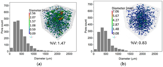 The samples from Steps 1 and 2 were characterized by industrial X-ray tomography (Metrotom 800, Carl Zeiss, Oberkochen, Germany) to evaluate 3D porosity. Was evaluated percentage of pore volume, distribution of the diameters, and the pore sphericity. Table 2 provides samples scanning parameters. The evaluations were performed using the VGStudio max 2022.1 software and the algorithm used was the “only threshold”. As the detection limit, the voxel size (20 µm) was considered.