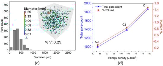Three-dimensional porosity and distribution chart of pore diameters in the Step 1 samples. Laser scanning speed of 1000 mm/s, power of 250 W, (a) C1—70 µm hatch space, (b) C2—80 µm hatch space, and (c) C3—100 µm hatch space. (d) Relationship between the volumetric energy density, the quantity of pores, and the volumetric percentage of pores.