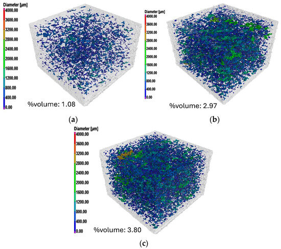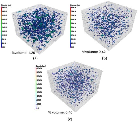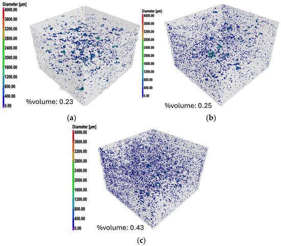 Three-dimensional porosity (%volume) of the samples from Step 2 to 200 W power and (a) Sample A—800 mm/s; (b) Sample B—1000 mm/s; (c) Sample C—1200 mm/s.