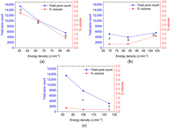 Figure 8 shows the relationship between energy density, the total number of pores, and the volumetric percentage of pores.
