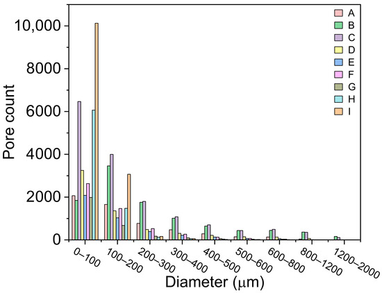 Figure 9 presents the distribution graphs of the pore diameters of samples A to I, produced in Step 2.