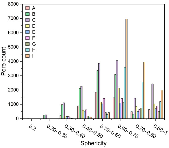 Figure 10 presents the graphs of sphericity distribution of the pores in samples A to I, produced in Step 2.