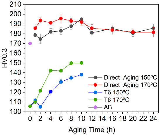 Figure 11 presents the aging curves of the AlSi10Mg alloy subjected to T6 treatment and direct aging, with temperatures of 150 °C and 170 °C, applied for different times. All heat-treated samples were manufactured using the optimized additive manufacturing