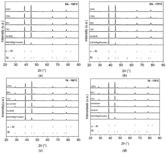 X-ray diffractograms (a,b) samples subjected to direct aging at 150 °C and 170 °C, respectively, and (c,d) samples subjected to T6 with aging at 150 °C and 170 °C, respectively, for different treatment times.