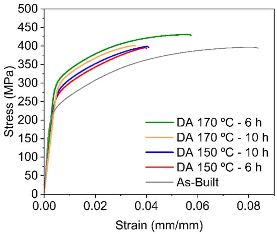 From the stress–strain curves of the samples subjected to direct aging at 150 °C and 170 °C for 6 and 10 h, the curve referring to the as-built material and the obtained mechanical properties (Figure 14) shows that the modulus of elasticity is similar for all conditions, indicating that this property did not undergo significant changes with the heat treatment, as expected.