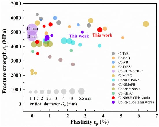 - Dun, C.C.; Liu, H.S.; Shen, B.L. Enhancement of plasticity in Co-Nb-B ternary bulk metallic glasses with ultrahigh strength. J. Non-Cryst. Solids 2012, 358, 3060–3064. [Google Scholar] [CrossRef]