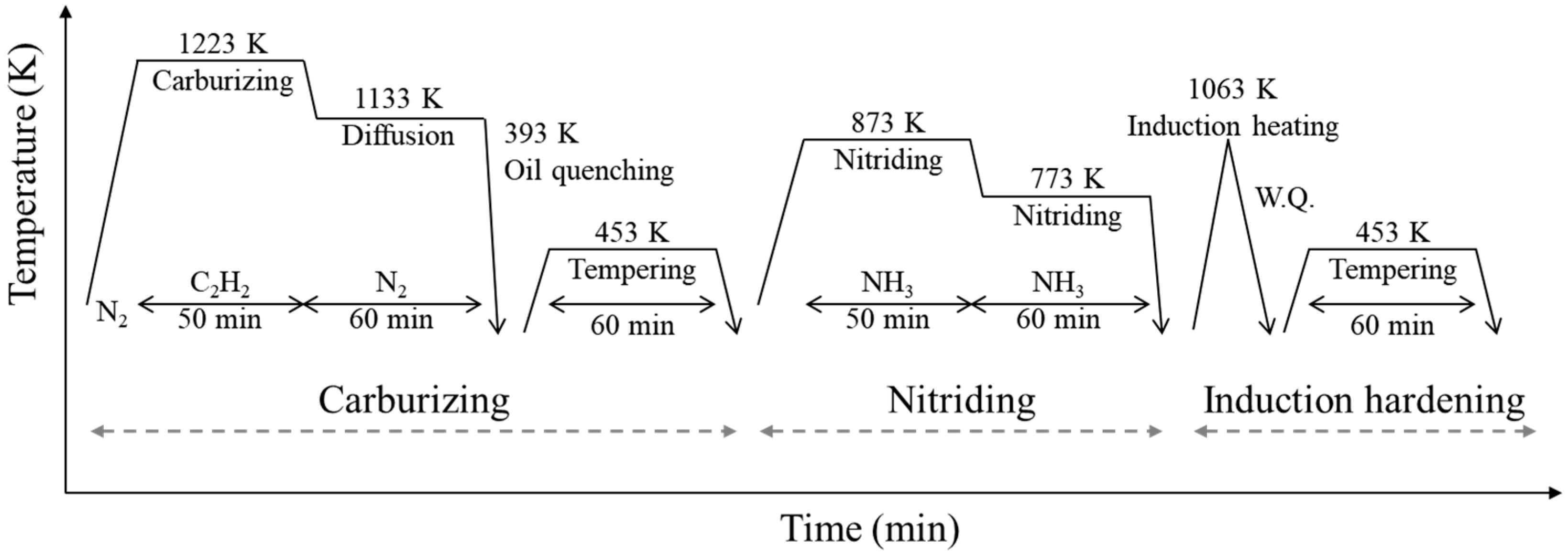 - Qin, S.; Wang, L.; Di, L.; Zhang, C.; Zhao, M. Effect of carburizing process on bending fatigue performance of notched parts of 18CrNiMo7-6 alloy steel. Eng. Fail. Anal. 2023, 147, 107161. [Google Scholar] [CrossRef]