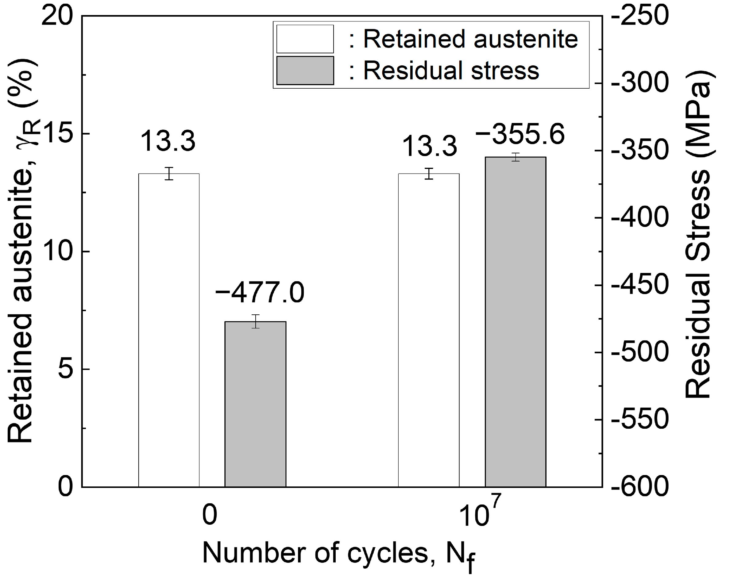 3.4. Progression of Retained Austenite (γR) and Residual Stress During Fatigue Testing