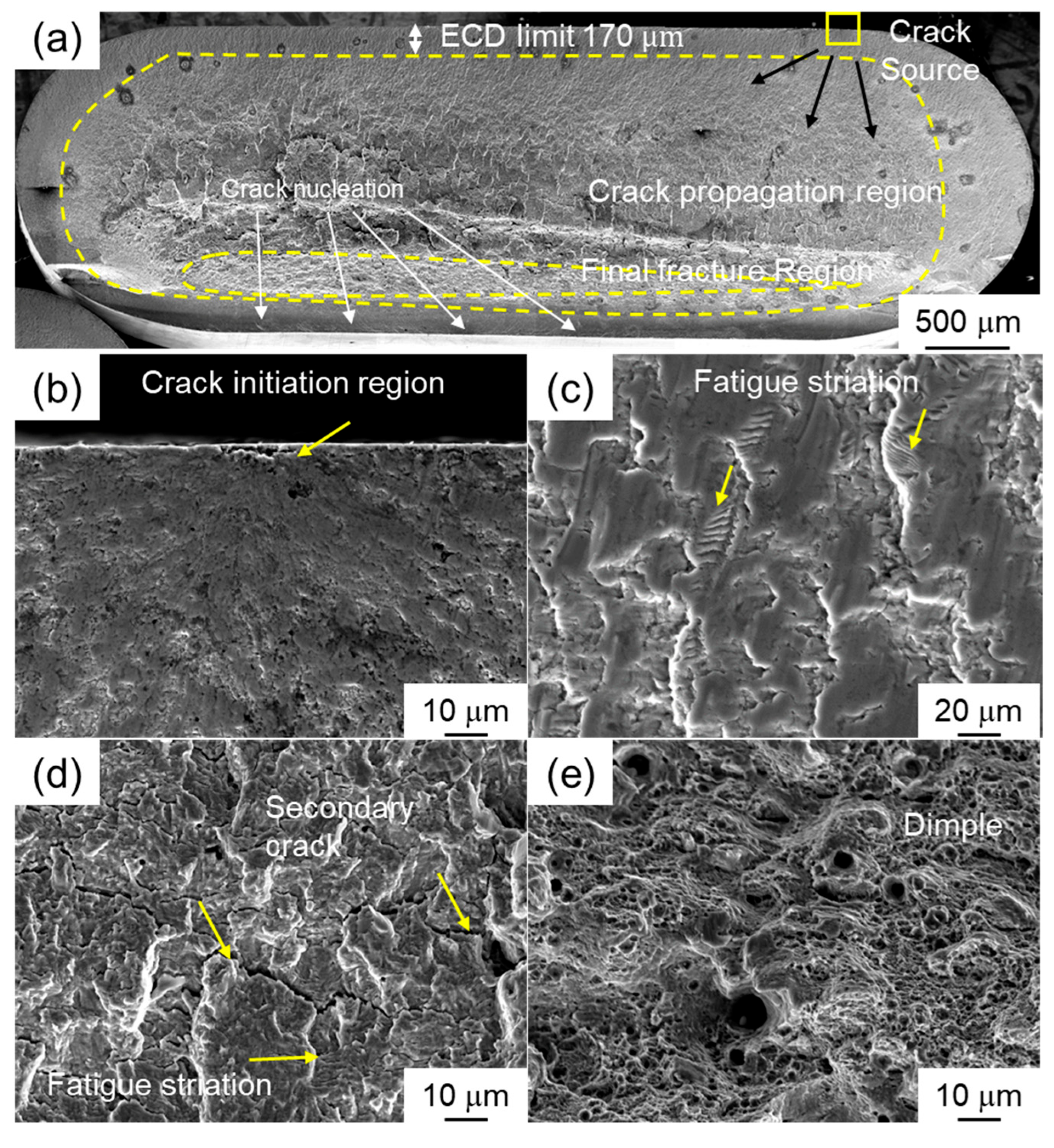 - Agnani, M.; Findley, K.O.; Thompson, S.W. Effects of retained austenite and martensite microstructure on fatigue crack propagation in quenched and tempered high carbon steels. Int. J. Fatigue 2024, 188, 108529. [Google Scholar] [CrossRef]