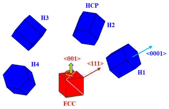 | H4 | (11-1)f//(0001)h | [−110]f//[2-1-10]h |
