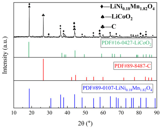 The raw materials utilized in the experiments were derived from mixed powders of the positive and negative electrodes of spent high-Mn lithium-ion batteries. These materials were sourced from domestic spent lithium battery recycling manufacturers. The chemical composition of the spent LIBs cathode powder is detailed in Table 1. As shown in the table, the Mn content of 18.10% is the highest in the cathode powder, and subsequent separation and recovery of Mn must consider interference with the separation of other elements. Other valuable elements, such as Ni, Co, and Li, also have high content levels, resulting in high overall recovery value.