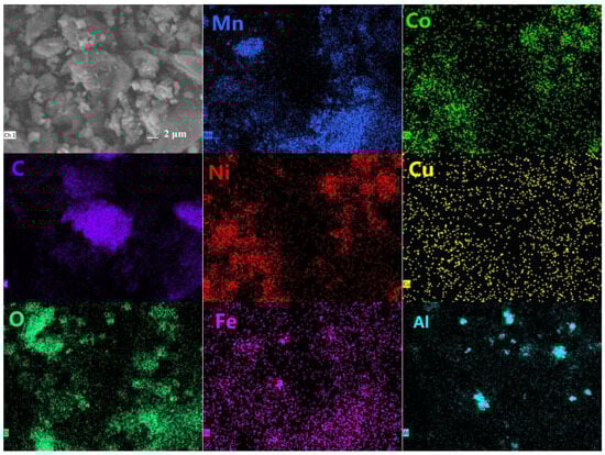 X-ray diffraction (XRD) phase analysis was conducted on the spent LIBs cathode powder through step scanning, as illustrated in Figure 1. The analysis revealed that the primary phases within the material are C, LiCoO2, and LiNi0.18Mn1.82O4. Owing to their low concentrations, Al, Fe, and Cu did not exhibit distinct peaks in the XRD spectra. The raw material consists of irregularly shaped, unevenly sized fine particles, as shown in Figure 2. Elemental surface scanning analysis (as shown in Figure 3) indicates that the distribution regions of manganese Mn, Ni, Co, and O overlap, forming a composite phase without distinct distribution boundaries. In contrast, Al and C exist as independent phases with recognizable phase boundaries, a distribution consistent with the results of XRD analysis.