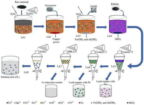 Following the precipitation process, different extractants, such as P204, P507, and Cyanex272, were utilized to assess their extraction effects. This comparison was crucial to selecting the most suitable extractant for the efficient separation and recovery of Ni, Co, and Li from the solution post-Mn precipitation. The final stage involved using HBL121 to enrich and recover Li through extraction and stripping processes. The complete procedural flow of these steps is illustrated schematically in Figure 4. The solutions before and after each process treatment are named using LAn (n: 1–8).