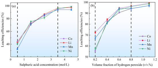 The concentration of sulfuric acid significantly influenced the leaching efficiencies of Li, Ni, Co, and Mn, as depicted in Figure 5a. As the concentration of sulfuric acid increased from 0.5 mol/L to 3.5 mol/L, the leaching efficiencies of these metals improved significantly, exceeding 94%. However, a further increase to 4.5 mol/L did not yield substantial changes in their leaching efficiencies.