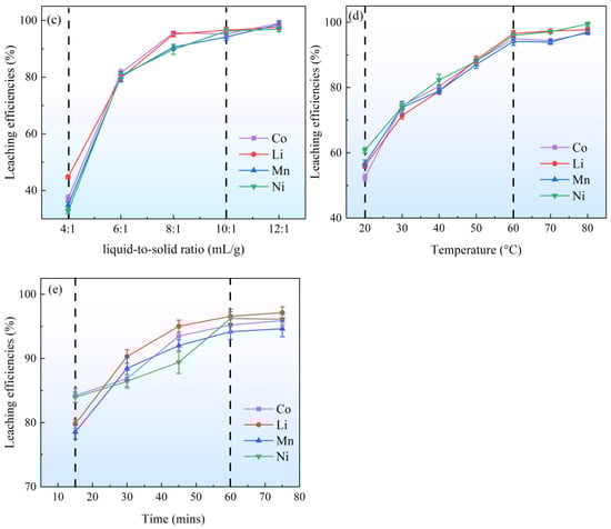 Experiments were conducted under one-factor-at-a-time conditions to assess the impact of various factors on the leaching efficiency of metals such as Li, Ni, Co, and Mn, among others. In these experiments, sulfuric acid concentration (0.5–4.5 mol/L), hydrogen peroxide concentration (0.2–1.1%, v/v), L/S ratio (4:1–12:1), leaching temperature (20–80 °C), and leaching time (15–75 min) were varied. The results of these studies are presented in Figure 5.