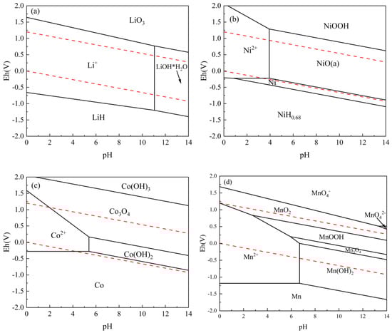 Eh−pH of each metal−H2O system at 60 °C; (a) Li−H2O; (b) Ni−H2O; (c) Co−H2O; (d) Mn−H2O.