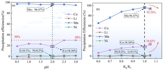 Figure 8a illustrates the varied response of metal precipitation efficiencies to changes in pH. The precipitation efficiency of Mn remained stable across varying pH levels, while Co showed a more dynamic response; its efficiency initially increased, then decreased slightly, before increasing again. The efficiencies of Ni and Li loss exhibited minimal fluctuation, consistently remaining below 3% and 1%, respectively. Notably, at a pH of 2, Co’s loss efficiency peaked at 18.36%, whereas Mn’s precipitation efficiency was high at 98.47%, identifying pH 2 as the optimal condition for Mn precipitation.