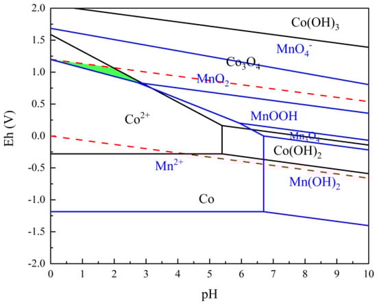 Eh-pH diagram of Mn-Co-H2O at 30 °C is depicted in Figure 9, where the green region in the upper left corner represents the overlap of soluble Co (II) and Mn precipitation below the O2 formation line (indicated by the upper dashed line). This narrow working range of Eh and pH values indicates the challenge in obtaining high-purity MnO2 in the presence of Co2+, which is prone to oxidizing and forming Co3O4 precipitates, as demonstrated by Equation (8) and confirmed by experimental results.