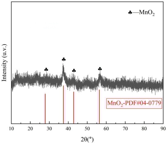 In the experiments, the leaching solution was adjusted to a pH of 2 and then subjected to constant temperature stirring in a water bath, with the addition of solid potassium permanganate at a Kp/Kt ratio of 1:1. This addition produced a brown precipitate, which persisted until the reaction’s completion. The solution was then filtered; the filter residue was dried for XRD analysis, and a quantitative sample of the filter residue was taken to determine the metal composition and content, as shown in Figure 10 and Table 4. The analysis of the filtrate’s physical phase confirmed the presence of MnO2 crystals, indicating the adequate precipitation of Mn2+ by potassium permanganate, thereby validating the experimental approach.