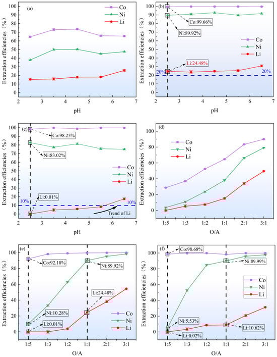 Further analysis was conducted to evaluate the impact of varying the organic-to-aqueous (O/A) phase ratio from 1:5 to 3:1 on the extraction efficiencies of Li, Ni, and Co using these extractants, as shown in Figure 11d–f. This analysis revealed that pH was not a selective factor for Ni, Co, and Li extraction, and the selective extraction efficiency of Co by P507 and Cyanex272 was higher. However, as the O/A ratio increased, so did the extraction efficiencies of Ni and Li, which negatively affected the separation of Co from solutions containing Ni and Li.