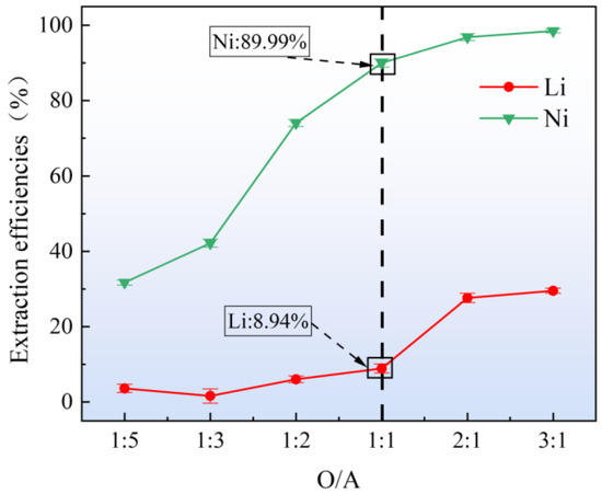 As the O/A ratio increased, both Ni and Li extraction efficiencies also rose, with the growth in Ni extraction outpacing that of Li. This differential in extraction growth rates facilitates the effective separation of Ni from Li. Before reaching an O/A ratio of 1:1, the efficiency of Ni extraction consistently improved, while Li losses remained below 9%. However, beyond an O/A ratio of 1:1, the increase in Ni extraction efficiency began to plateau, and the loss efficiency of Li escalated to 27.72%.