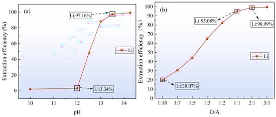 After the extraction of Ni and Co, residual Li in the solution (LA6) necessitated a focused recovery effort due to its relatively low concentration of 1.6 g/L. HBL121 was chosen as the extractant for enriching Li. The extraction conditions were optimized to include a 30% HBL121 (v/v), an O/A of 1:1, an extraction temperature of 30 °C, and a duration of 10 min. The impact of pH on the Li extraction efficiency was thoroughly investigated, with results presented in Figure 13a. Notably, Li extraction efficiency remained extremely low, nearly zero, within the pH range of 10 to 12. However, Li extraction efficiency surged at a pH above 12, reaching over 95% at a pH of 13.5, which was determined to be the optimal pH for extraction.