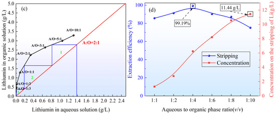 Given these findings, an O/A ratio of 1:1 was selected as optimal for the efficient stripping of the loaded organic phase, as higher ratios may complicate the process. The extraction isotherms under different conditions, depicted in Figure 13c, indicated that achieving a theoretical extraction efficiency of 99.5% for Li at 25 °C would require a three-stage countercurrent extraction process at an O/A ratio of 1:3.