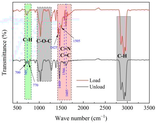 Comparing the Fourier transform infrared spectra of the HBL121 extractant before and after lithium loading in Figure 14, the peaks at 1605 cm−1 and 1566 cm−1 are enhanced after loading, while the symmetric peaks at 700 and 770 cm−1 in the fingerprint region disappear, indicating that the C=N bond plays an important role in the extraction process. Simultaneously indicating that N−H is replaced to form a new complex N−Li, while other characteristic peaks show no significant changes.
