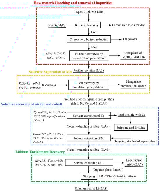 Proposed flow sheet for separation and recovery of Ni, Co, Mn, and Li from spent high-Mn lithium-ion batteries.
