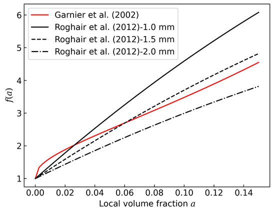 Second, based on experimentally validated simulations, Roghair et al. [19] proposed a new drag correlation, taking into account Eotvos numbers ranging from 0.13 to 4.9 and gas hold-ups up to 40% (30% for Eo 0.3). The comprehensive range of conditions, particularly its validation for smaller bubble sizes and high void fractions, makes this model highly relevant. The relationship between the bubble swarm drag correction coefficient and the gas phase volume fraction, as calculated from these correlations, is plotted in Figure 1.